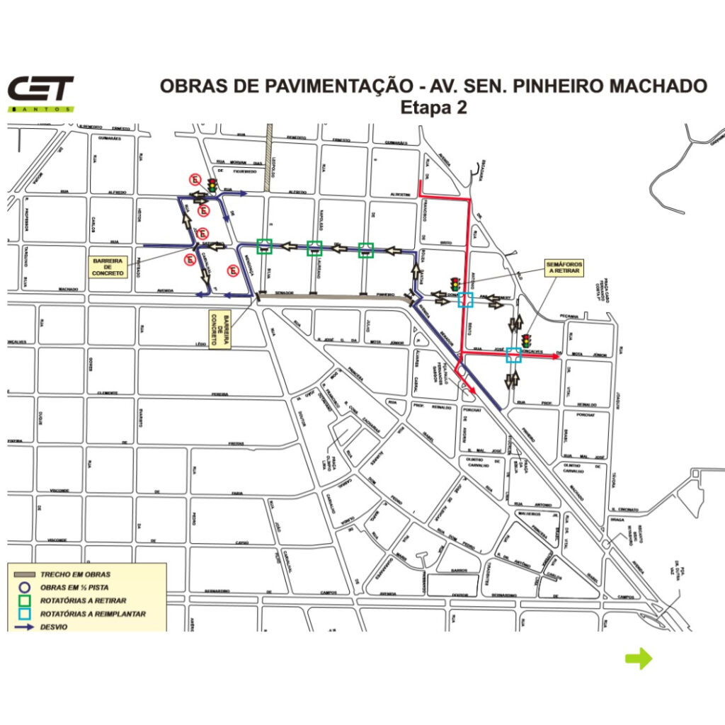 Já os semáforos instalados para a realização da primeira etapa das obras na Pinheiro Machado, localizados nos cruzamentos das ruas José Gonçalves da Mota Júnior com Professor Delfino Stockler e Antonio Bento com Rua Ana Néri serão desativados e essas intersecções voltarão a contar com rotatória.