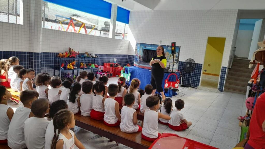 A primeira ação foi na Creche Ismênia de Jesus, onde foram necessárias três apresentações do Teatro de Fantoches para o atendimento total de 111 alunos da entidade. De maneira divertida, cantando e interagindo com o Pedrinho e o vovô João, os bonecos interpretados por educadores da Companhia, eles receberam informações importantes sobre o significado dos sinais de trânsito, uso da faixa de pedestre, travessia sempre sob os cuidados de um adulto e outras dicas.