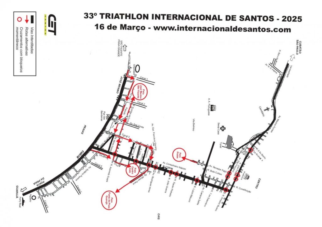 A disputa do 33º Triathlon Internacional de Santos, neste domingo (16), vai movimentar a Cidade e exigir alterações no sistema viário. A Companhia de Engenharia de Tráfego (CET-Santos) acionará operação de trânsito para o evento, promovendo interdições e desvios em ruas e avenidas.